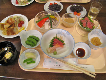 アジのフライトエビフライとサラダ、豚の冷シャブごまだれとまいたけとエリンギとインゲンとパプリカ黄と赤、牛たたき、さしみ(あまえび、いか、まぐろ、クラゲ、)枝豆、おしんこ、お吸い物(卵となめこと麩、)デザート(ぶどうとさくらんぼ)ご飯、スパークリングワイン、アイスクリーム、高級つぶあんぱん。以上(注Ei Yokooのブログではありません)